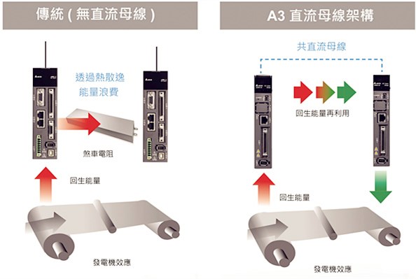 多軸共直流母線設(shè)計(jì),保持直流母線電壓穩(wěn)定,回生能量再利用,機(jī)械設(shè)備更節(jié)能多臺(tái)驅(qū)動(dòng)器使用共直流母線功能,節(jié)省煞車電阻使用數(shù)量,降低成本