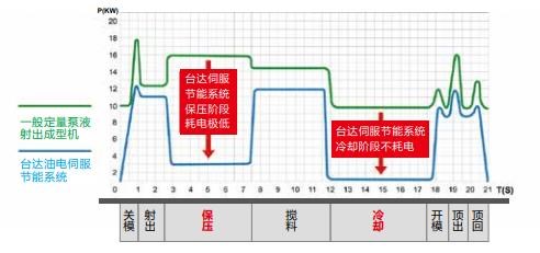 臺達油電伺服節能系統,精確控制每個過程所需的壓力與流量,消除高壓節流的能源損耗,達到節能省電、提升成型品精度、提升競爭力、增加產能,一舉數得。?