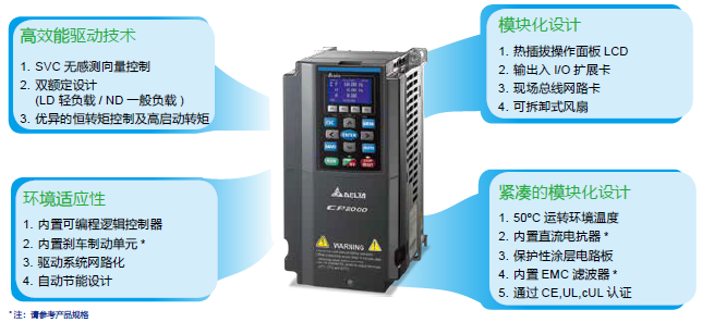 CP2000系列為無感矢量控制變頻器,延續臺達設計團隊對節能省電理念的一貫性,針對風機、水泵、HVAC Drive相關應用特制化、PID智能調適和優異設計的產業效能所推出的變頻器。其無感矢量控制(SVC)的智能表現,適時提升負載轉矩響應,滿足客戶寬廣的變轉矩負載需求,提升馬達在一般用途的效能。3段式V/F冪級曲線響應,能在變動轉矩負載的環境下,適時的調整輸入電壓來提高整體效能,特別是水泵,風機負載之類的應用。FLYING START、自動加減速功能、瞬時停電再啟動,馬達參數AUTO-TUNING等功能,對變轉矩負載的環境操作及保護,提供適當的運行及節能方桉。?