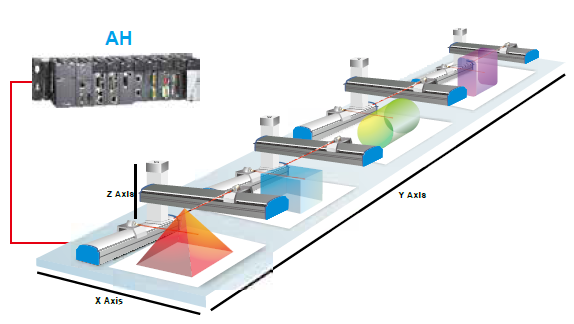 • AH500的運動控制功能,可實現任意三軸直線插補、任意兩軸圓弧插補、及任意三軸螺旋插補與連續插補功能,透過臺達DMCNET高速通訊網絡架構,更可達到1ms的指令周期內12軸同動或4組3軸同動插補功能。無論是復雜的過程控制或是精密的運動控制需求,都能透過AH500來實現,有效應用于各種產業機臺,如建材機,經編機,食品包裝機等等。